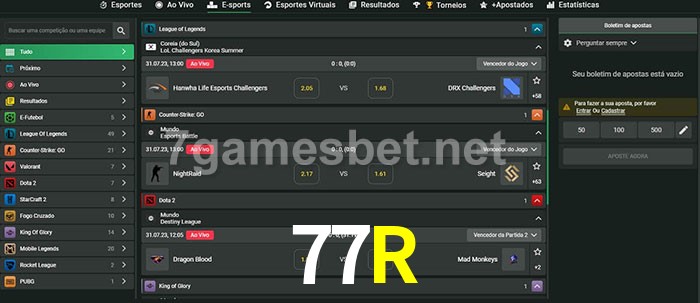A aposta 77R oferece aos jogadores a experiência mais conveniente de apostas em eSports!